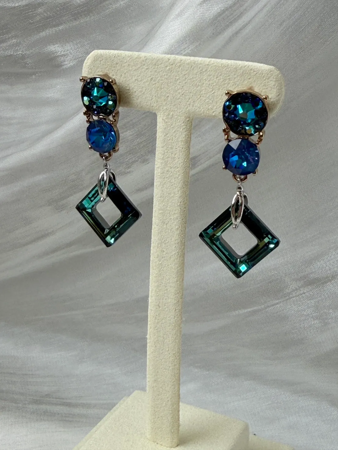 簍空菱形耳環,寶石藍綠色